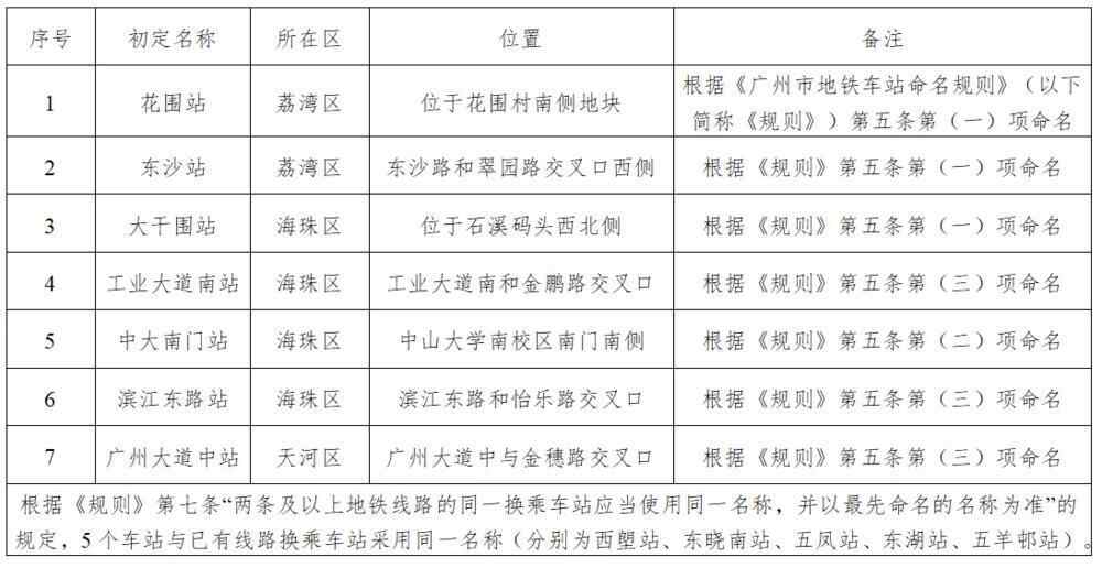 地铁十号线工程(西塱—广州大道中)共设12个车站,其中5个车站与已有线路换乘车站采用同一名称(分别为西塱站、东晓南站、五凤站、东湖站、五羊邨站),7个新命名车站分别为花围站、东沙站、大干围站、工业大道南站、中大南门站、滨江东路站、广州大道中站。