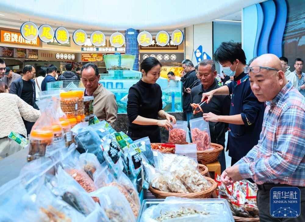 ↑ 4月2日,旅客在深汕西高速长沙湾服务区乡村振兴特产专卖区选购汕尾土特产。