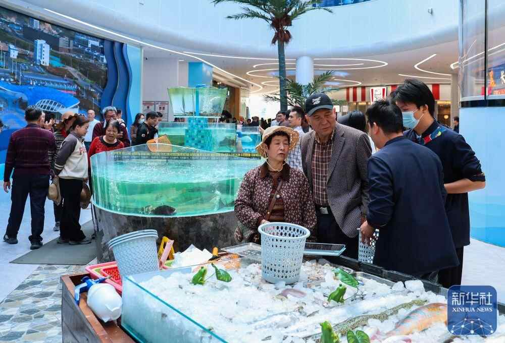 ↑ 4月2日,旅客在深汕西高速长沙湾服务区餐厅选购汕尾海鲜。