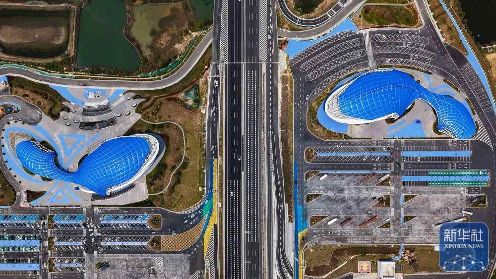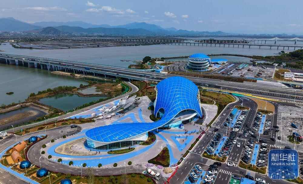 ↑ 深汕西高速长沙湾服务区“蓝鲸天幕”外观(4月2日摄,无人机照片)。