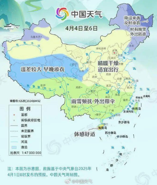 南方有大片区域将上线“雨纷纷”模式,雨量总体不大,以小到中雨为主,但4日至6日期间,贵州东部、湖南南部、广西北部等地局地有大雨。此外,四川等地部分地区还可能出现雨夹雪或雪,上述地区小伙伴外出需随身携带雨具。