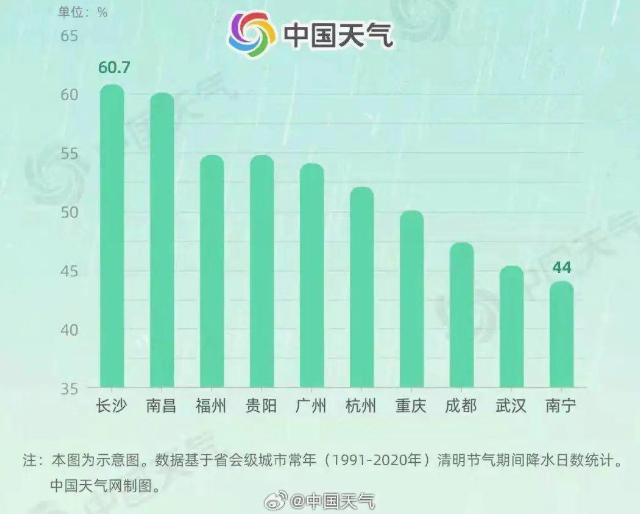 常年来看,我国南方地区清明时节与诗人杜牧笔下“清明时节雨纷纷”的景象十分吻合,其中长沙、南昌出现降雨概率近6成。