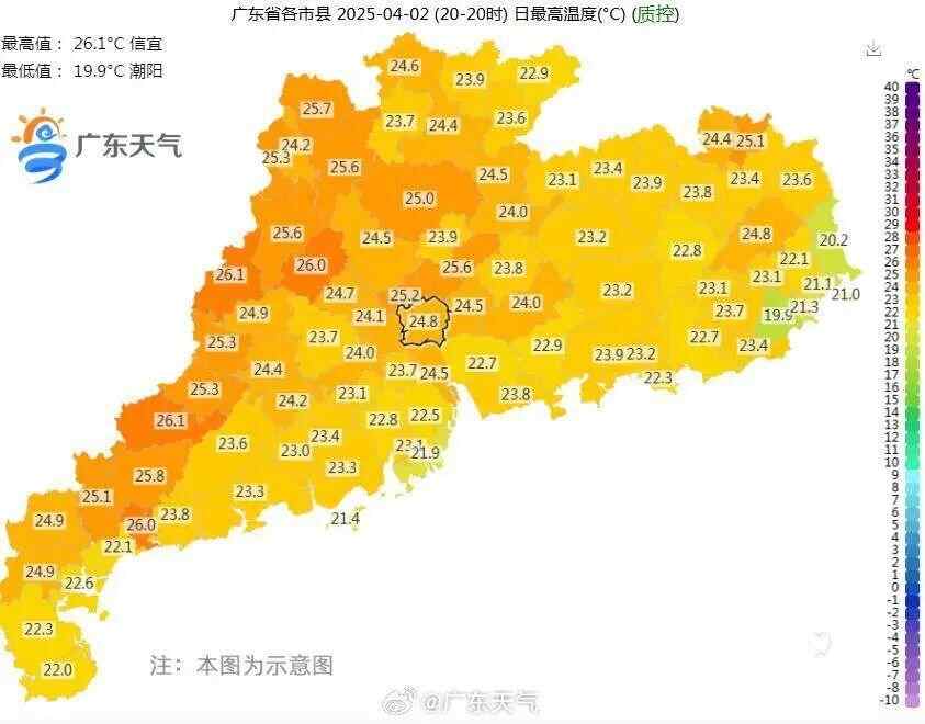 4月2日广东省各市县日最高温度图显示,