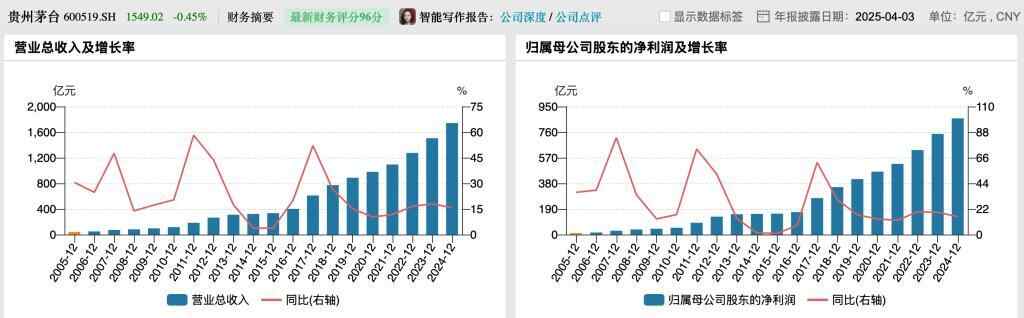 据Wind数据显示,茅台去年业绩再创新新高,但增速有所放缓,过往近20年贵州茅台业绩呈稳步向好发展。