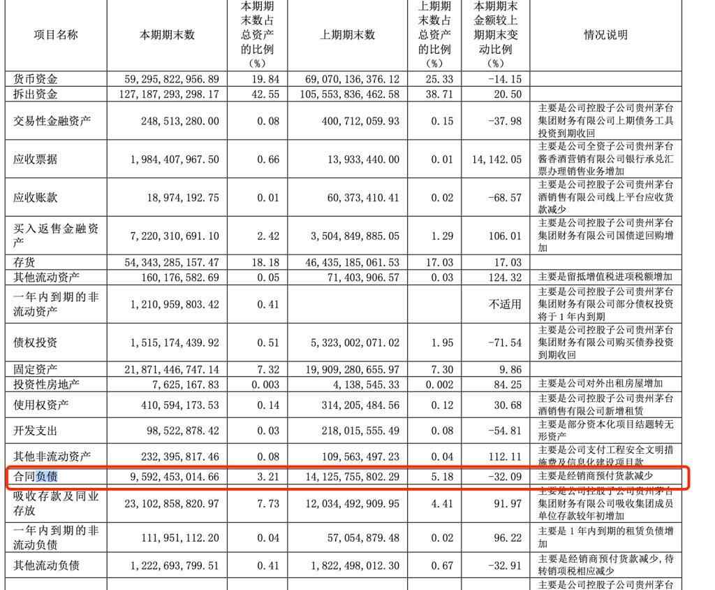 作为判断酒企未来发展的重要指标,合同负债在一定程度上代表了企业未来取得营收的能力。去年,贵州茅台的合同负债约为95.92亿元,上年年底为141.26亿元,同比下滑超三成。财报指出,主要是由于经销商预付货款减少。