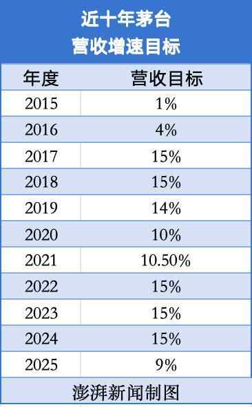 值得注意的是,记者梳理过往贵州茅台十年年报发现,2015年至2024年营业目标均符合或超出预期。其中,2022至2024年的总营收目标均为同比增长15%。这也是自2017年以来,首次营收增速目标下调至个位数。