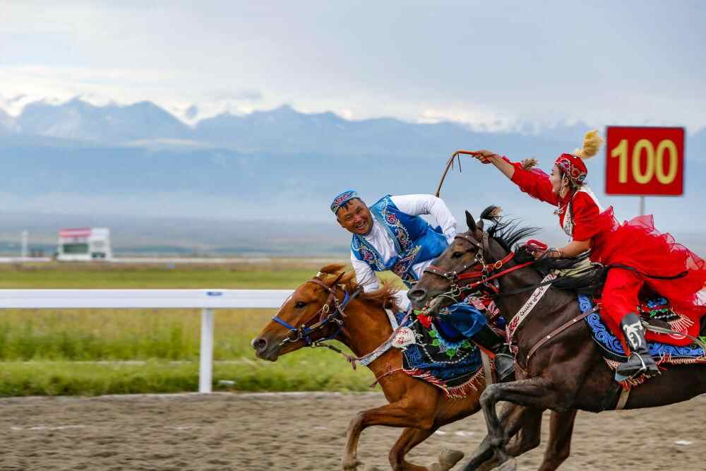 2024年7月10日,新疆代表团运动员在新疆昭苏参加表演项目竞技类“姑娘追”比赛。新华社记者 陈朔 摄