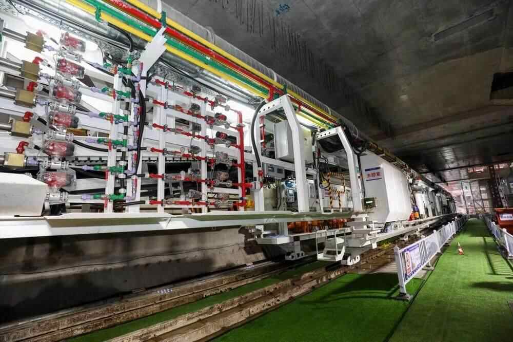 景广区间右线隧道需近距离上跨既有运营地铁线,垂直最小净距仅有2.4米,且区间地质主要为灰岩,岩溶发育强烈,给隧道施工沉降控制及保障掌子面稳定带来极大挑战。为保障施工和既有运营地铁线路安全,在盾构上跨线路前,地铁建设者们开展试验段掘进,全面统计、深入分析各项指标,精准选定最优盾构掘进姿态及施工参数,并对既有运营地铁线路地面进行地质雷达探测,确保施工安全。掘进过程中,实行24小时地面值班巡视,利用智能监测系统和精细化施工组织管理,实现毫米级沉降控制,确保盾构每一环掘进对周边环境的影响降到最低。
