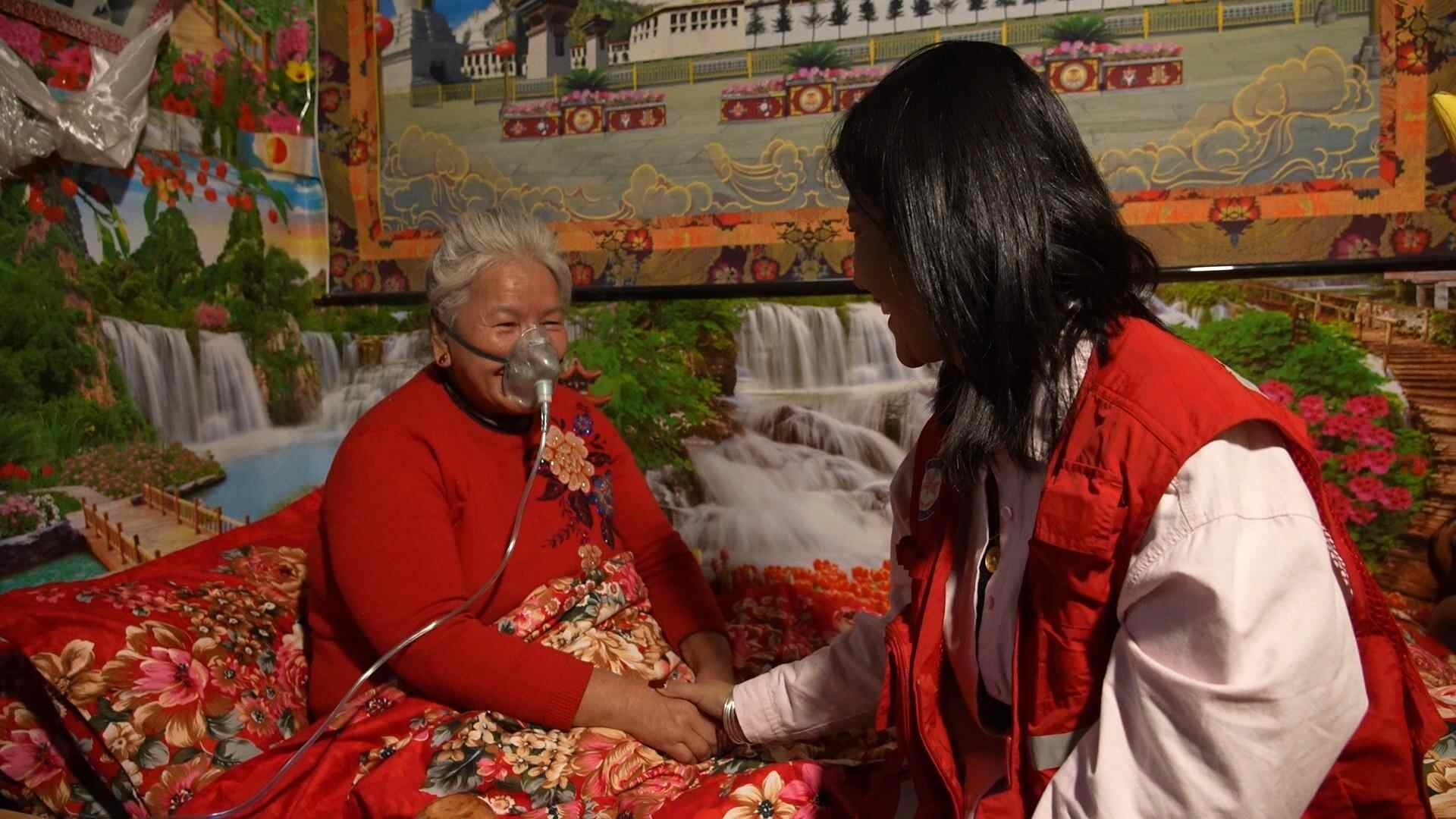 西藏拉萨市城关区雪社区居民尼玛:政府对我们老年人的照顾很周到,配了这么多设备,只要自己不舒服,按这个按钮就可以了,像雪居委会、社区医院医生都会马上过来,非常感谢。
