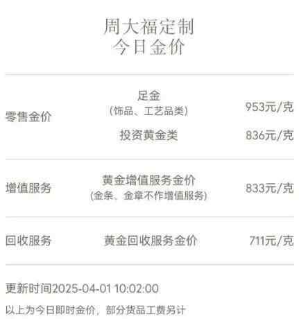 4月1日,现货黄金、COMEX黄金期货均续创新高。当日上午10点25分,黄金涨至3139.92美元的新纪录高位。4月1日,周大福金店饰品价格已调整至953元/克。黄金品牌周生生足金饰品报价949元/克。
