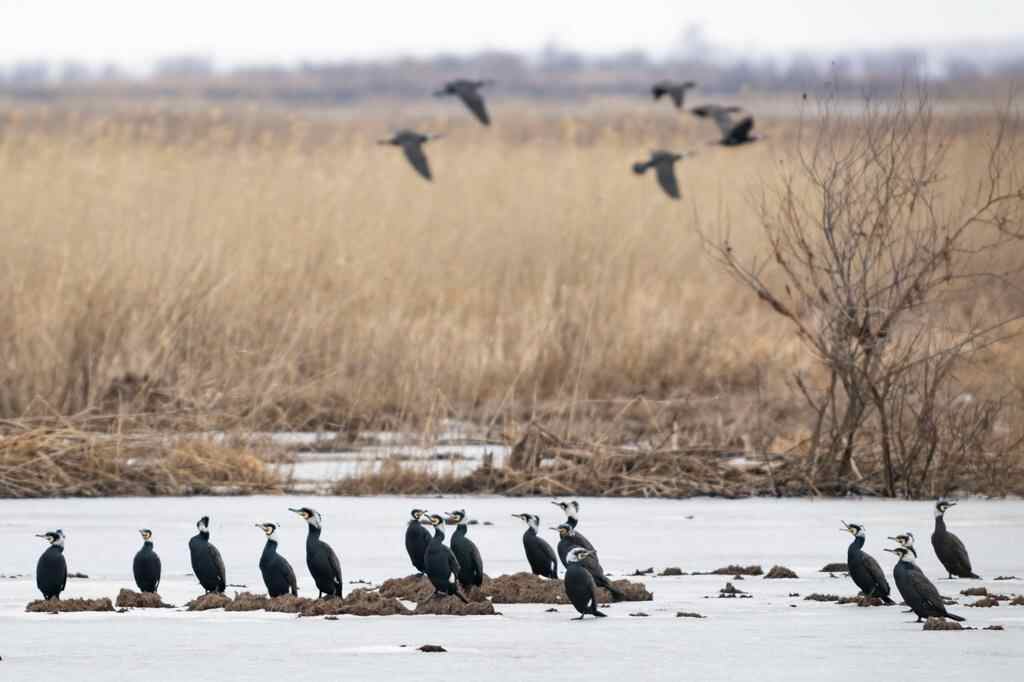 这是4月1日拍摄的兴凯湖国家级自然保护区内的普通鸬鹚。