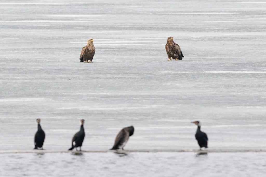 这是4月1日拍摄的兴凯湖国家级自然保护区内的白尾海雕(上)与普通鸬鹚。
