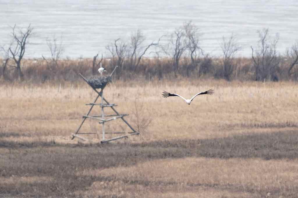 4月1日,在兴凯湖国家级自然保护区内,东方白鹳从人工巢穴中起飞。