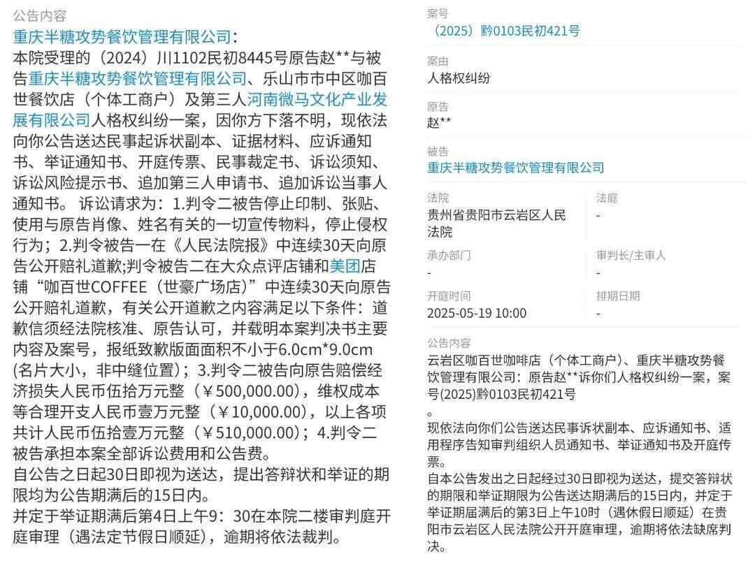 企查查App信息显示,半糖攻势公司作为被告同时有四个司法案件等待开庭。除了前述人格权纠纷的案件外,还有关于特许经营权纠纷的案件,四月中旬将在重庆市渝中区人民法院开庭。