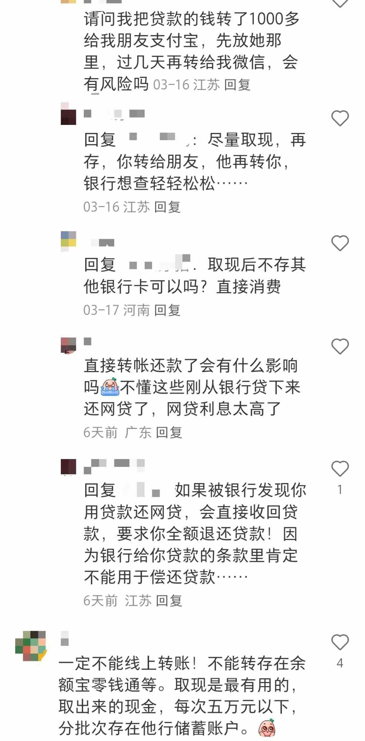 有网友在评论区表示:“下款后一次性取出大额现金,然后找朋友帮忙‘分流’,多转几次,就可以还贷款。”