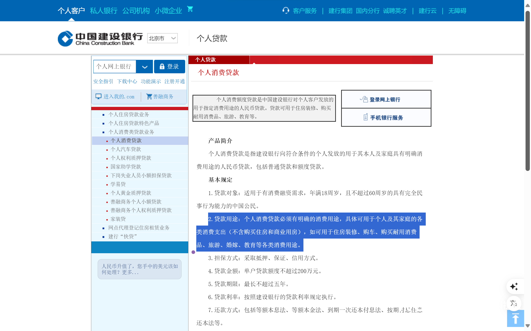多家银行也曾在公告中明确消费贷用途。如,中国建设银行官网就明确指出,个人消费贷款可用于住房装修、购车、购买耐用消费品等。