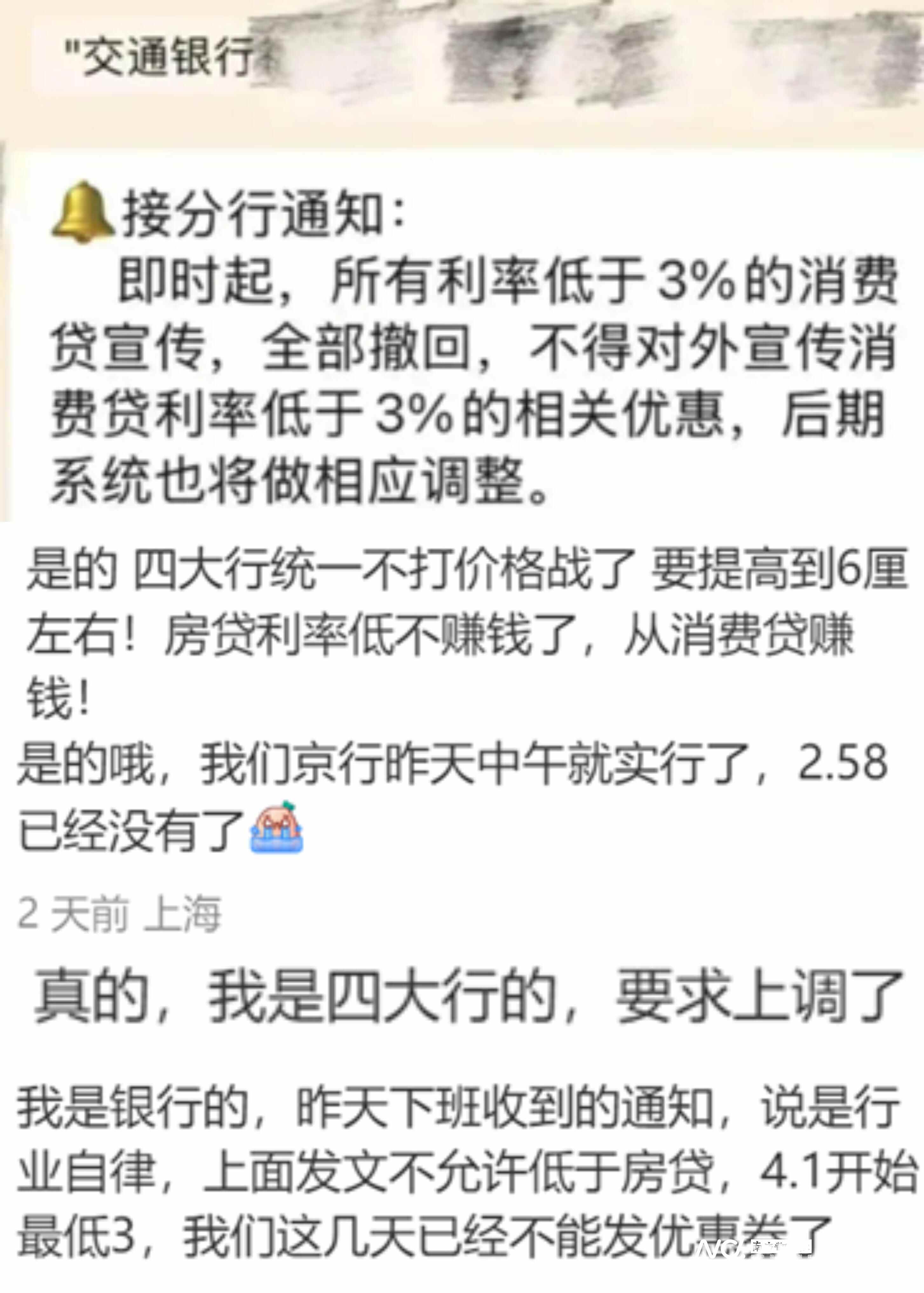 也有网友自称是银行的工作人员,在评论区透露:“接到通知,要求撤回利率低于3%的消费贷宣传。4月1日起,消费贷利率均会调整到3%,目前已停止发放优惠券。”