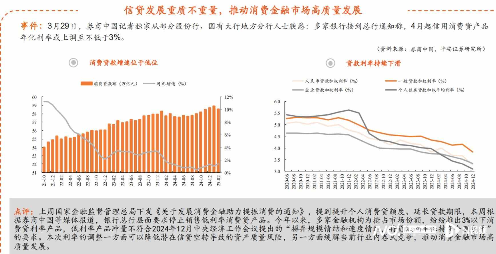 平安证券点评称,今年以来金融机构为抢占市场份额,纷纷推出3%以下消费贷利率产品,低利率产品冲量不符合2024年12月中央经济工作会议提出的“摒弃规模情结和速度情结,将贷款利率保持在合理水平” 的要求。本次利率的上调,一方面可以降低潜在信贷空转导致的资产质量风险,另一方面缓解当前行业内卷式竞争,推动消费金融市场高质量发展。