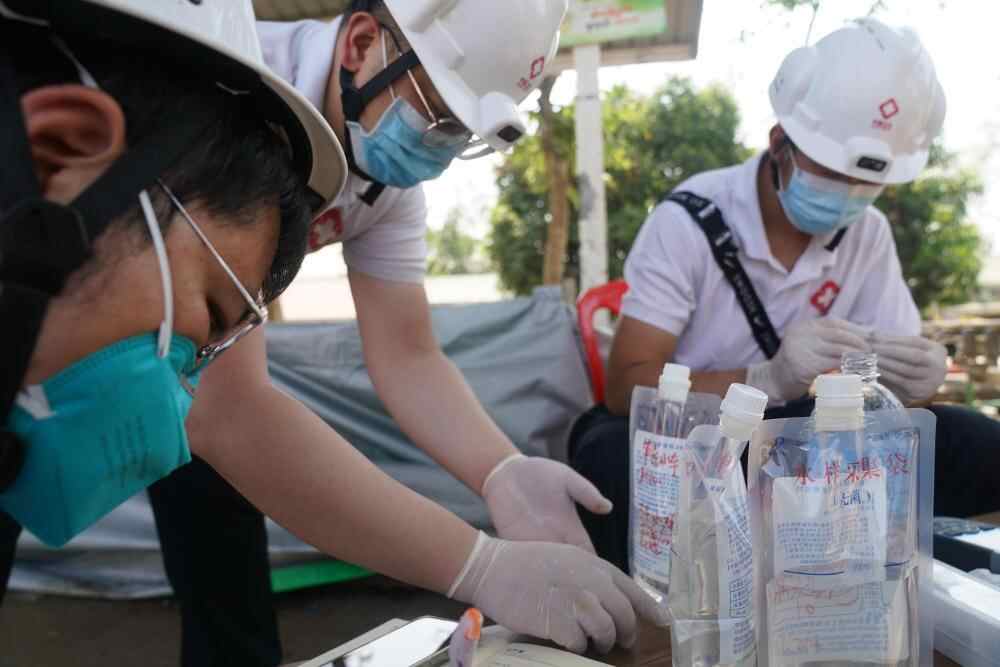 3月31日,在缅甸首都内比都的千床医院,中国云南救援医疗队的疾控专家采集医院内的饮用水和生活用水进行指标分析。