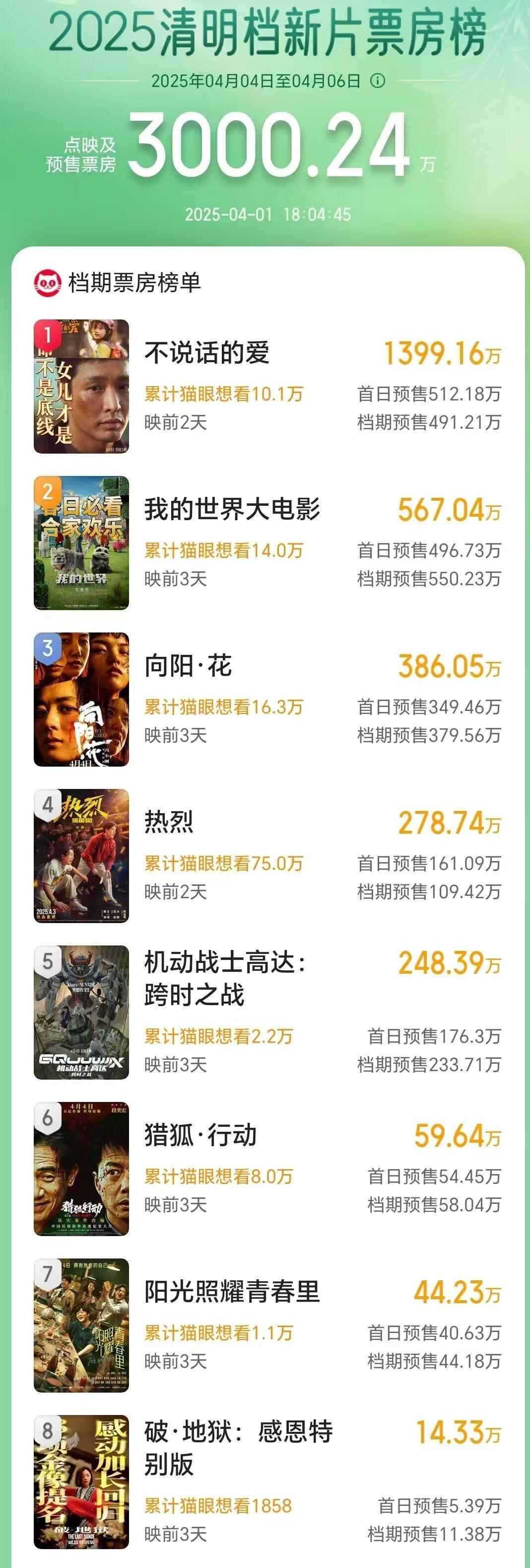 据网络平台数据,2025年4月1日18时04分,2025年清明档新片预售总票房超3000万,《不说话的爱》《我的世界大电影》《向阳·花》暂列清明档新片票房榜前三位。