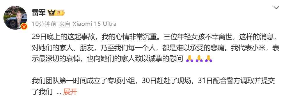 29日晚上的这起事故,我的心情非常沉重。三位年轻女孩不幸离世,这样的消息,对她们的家人、朋友,乃至我们每一个人,都是难以承受的悲痛。我代表小米,表示最深切的哀悼,也向她们的家人致以诚挚的慰问。