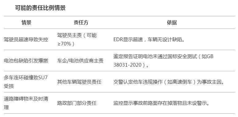 小米SU7高速碰撞爆燃致3人死亡的事故,其责任认定需综合技术鉴定、驾驶行为、车辆设计、道路环境等多方因素,最终由交警部门或司法机构判定。