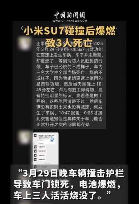 近日,一辆小米SU7在高速公路发生碰撞后车辆爆燃,造成3人身亡,引发关注。