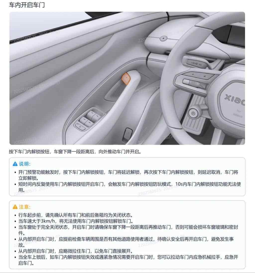 据小米汽车官网的SU7用户手册,在介绍“车内开启车门”的部分,手册提示:“当全车上锁后,如车门内解锁按钮失效或遇紧急情况需要开启车门时,您可以拉动车门内应急机械拉手,应急开启车门。”