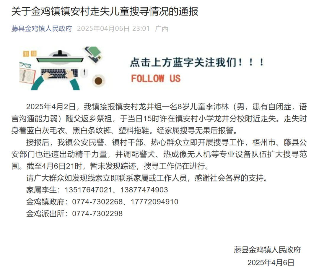 接报后,我镇公安民警、镇村干部、热心群众立即开展搜寻工作,梧州市、藤县公安部门也迅速出动精干力量,并调配警犬、热成像无人机等专业设备队伍扩大搜寻范围。截至4月6日21时,暂未发现踪迹,搜寻工作仍在进行。