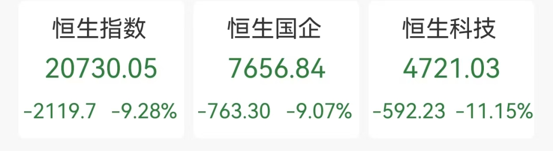 香港恒生指数开盘跌9.28%,恒生科技指数跌11.15%,药明康德、联想集团等个股跌近15%,阿里巴巴、腾讯等跌超10%。