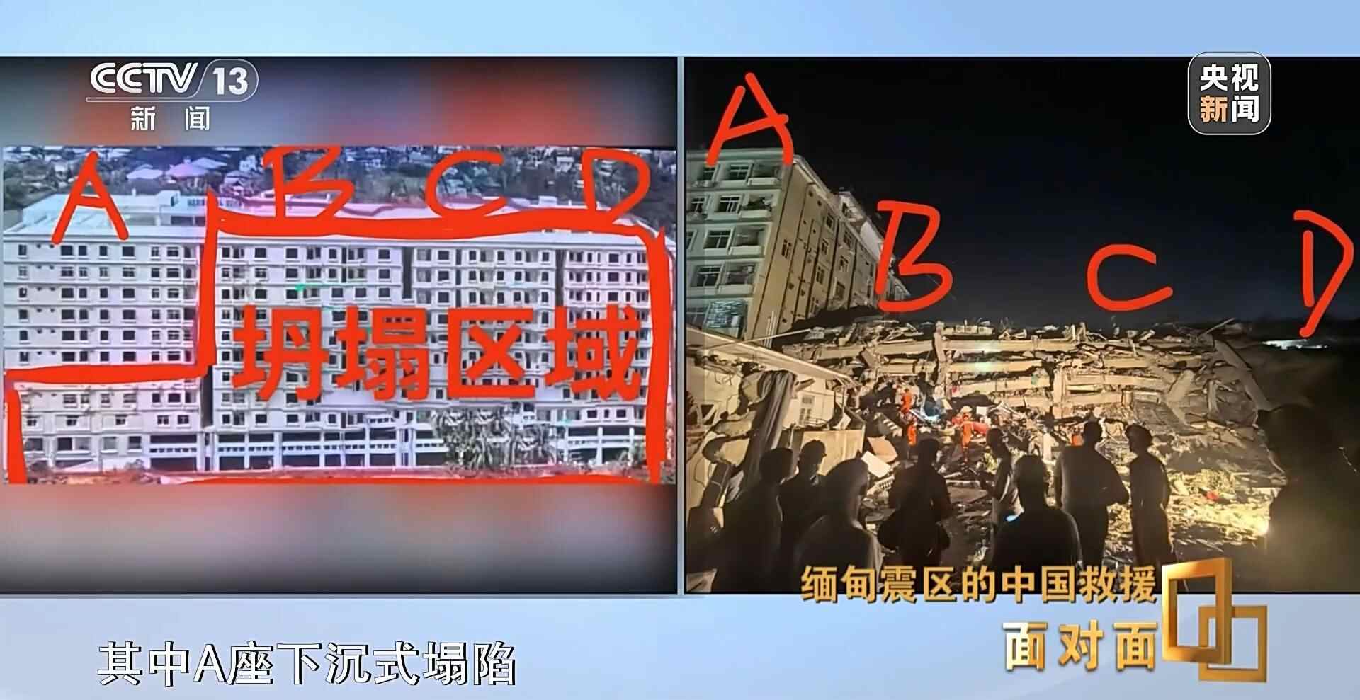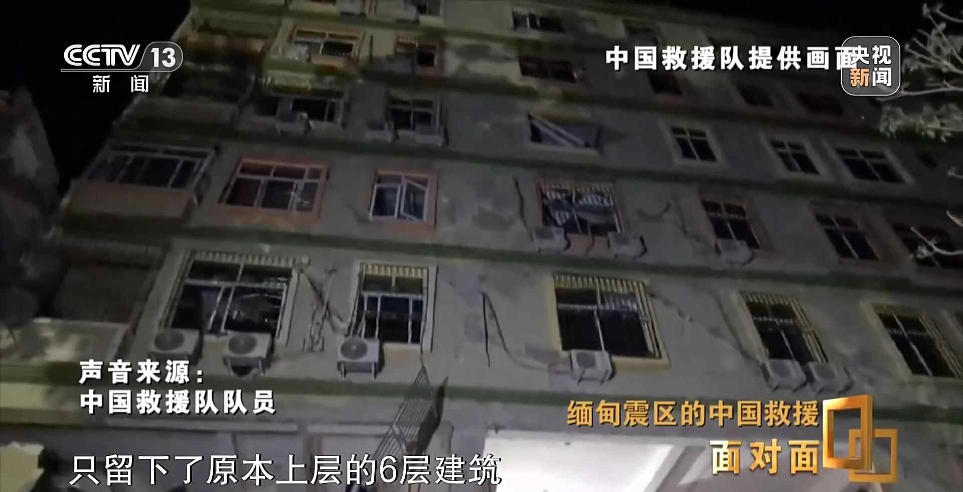 总台央视记者 张腾飞:现在是缅甸时间晚上的七点半,我们跟随中国救援队的先遣队来到了当地被称为长城饭店的地方,通过现场我们看到,受这次强震的影响,这栋酒店有一半的面积都出现了严重倾斜,而且特别是底层,出现了粉碎性坍塌。