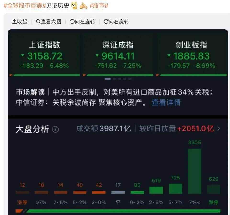 4月7日,A股三大指数早盘集体下跌,截至午盘收盘,沪指跌6.34%,深成指跌8.01%,创业板指跌9.74%。(回顾:突发!全线暴跌)