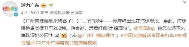 近日,“三有”物种——赤麻鸭出现在海珠湿地,海珠湿地鸟类提升至202种。游客说,远看好像“焦糖面包”。