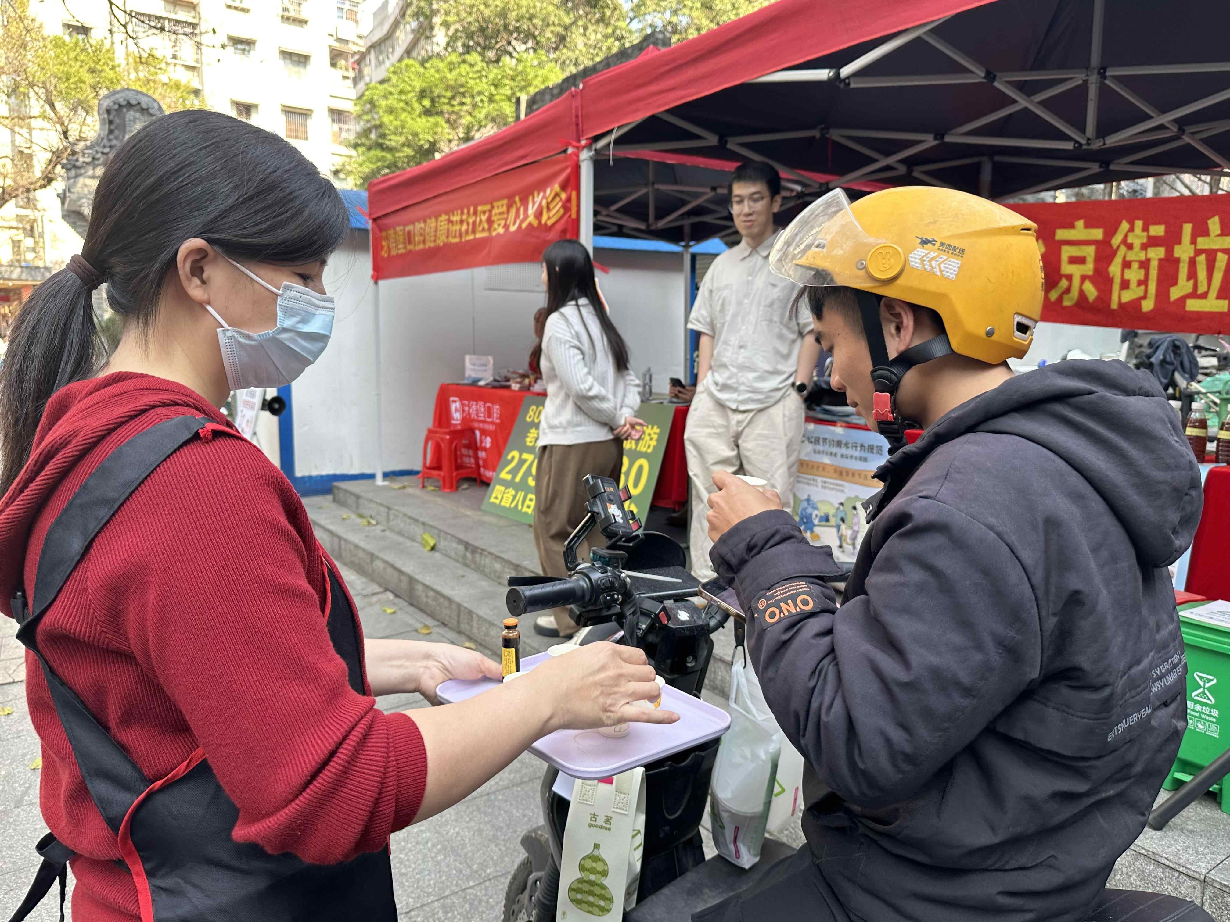“志愿新活力”健康护新行动也是雷锋月亮点活动之一,活动联合公益商家在书坊街西侧广场,精准服务外卖骑手、快递员等新就业群体。活动现场设置三大服务区:能量补给站提供免费茶饮及消费礼包,健康守护站开设中医诊疗、口腔检查及养生茶饮专区,政策加油站则提供旅居政策咨询和职业保障指南。