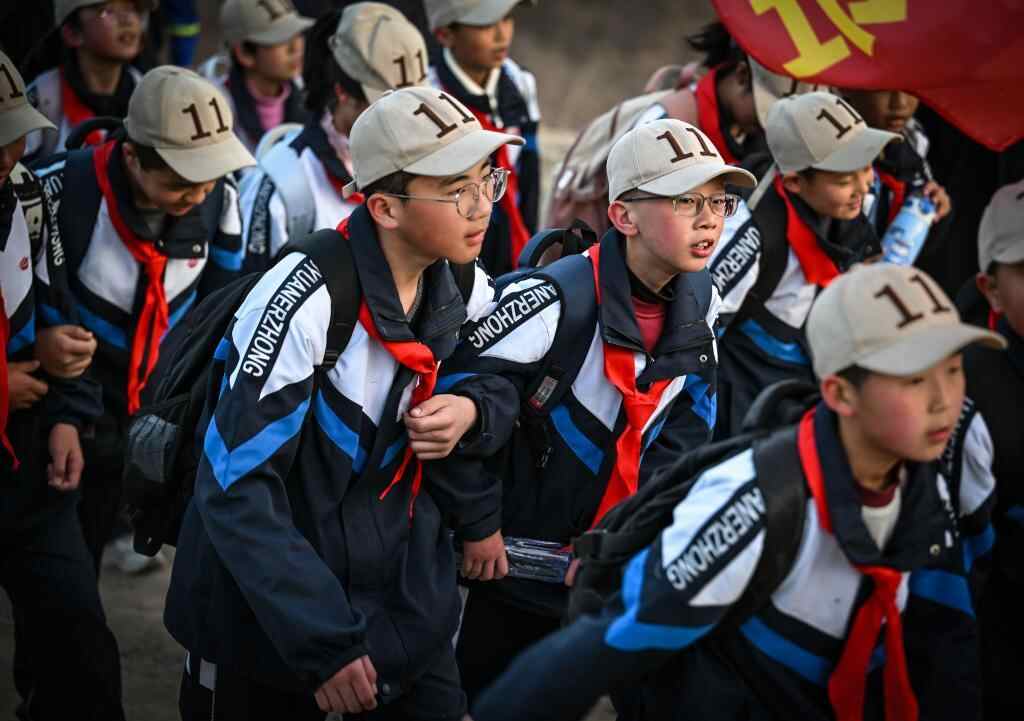 清晨6点多,天色渐亮,山间涌动的晨风带着寒意,吹红了少年的耳朵和脸颊。山路蜿蜒曲折,尘土飞扬、砂石遍地,我们与学生一起翻山越岭,他们唱着红歌、互相搀扶的画面,定格在我的镜头中。由于采访任务在身,很遗憾我未能与学生们走完全程。