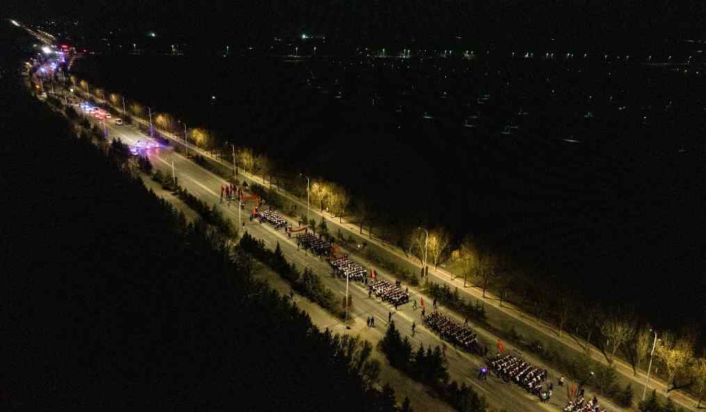 4月3日凌晨,参加徒步祭英烈活动的师生从固原市城区出发,前往位于彭阳县的任山河烈士陵园祭奠英烈(无人机照片)。