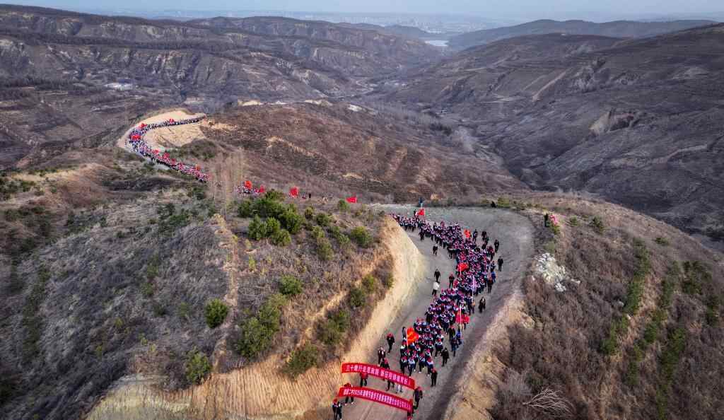 4月3日,参加徒步祭英烈活动的师生们翻越黄峁山。