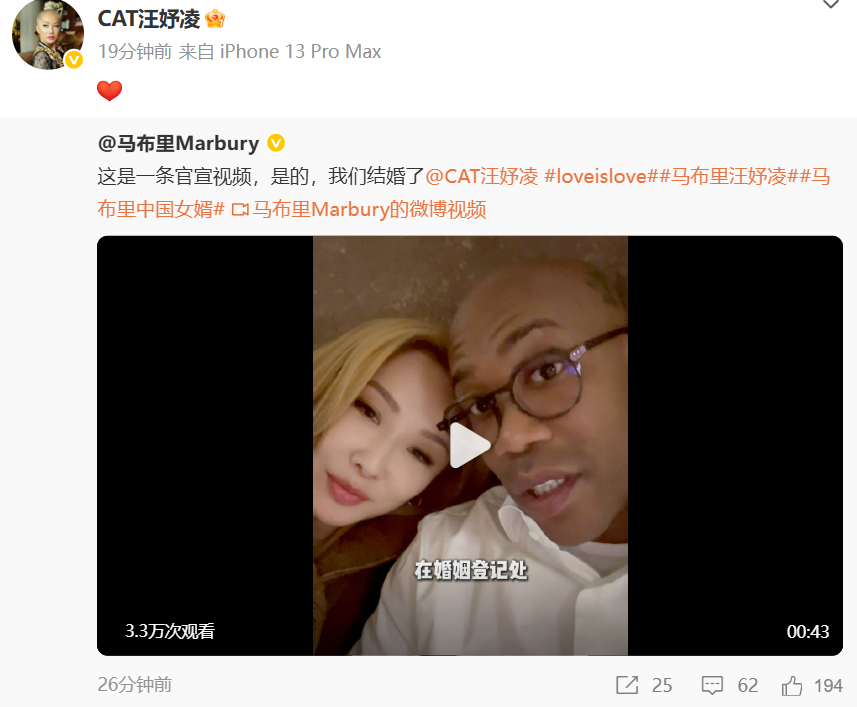 马布里写道:这是一条官宣视频,是的,我们结婚了,并艾特汪妤凌。视频中,马布里称自己成了中国女婿、武汉女婿。