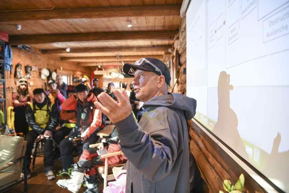 在新疆阿勒泰禾木吉克普林国际滑雪度假区,一名来自新西兰的滑雪专家向中外雪友讲授滑雪知识(2024年12月3日摄)。