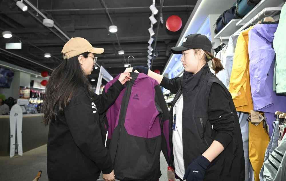 1月22日,在新疆阿勒泰市的一家雪具店,来自成都的张念慈(左)和同事深阿尔·金恩斯别克一起整理滑雪服。