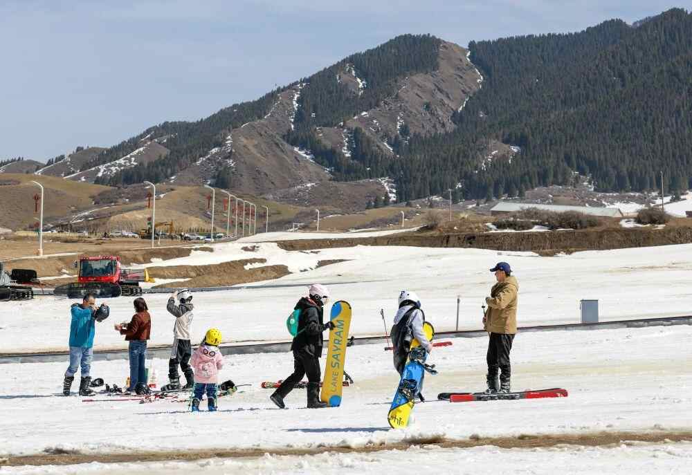 4月5日,雪友在新疆丝绸之路山地度假区滑雪嬉戏。