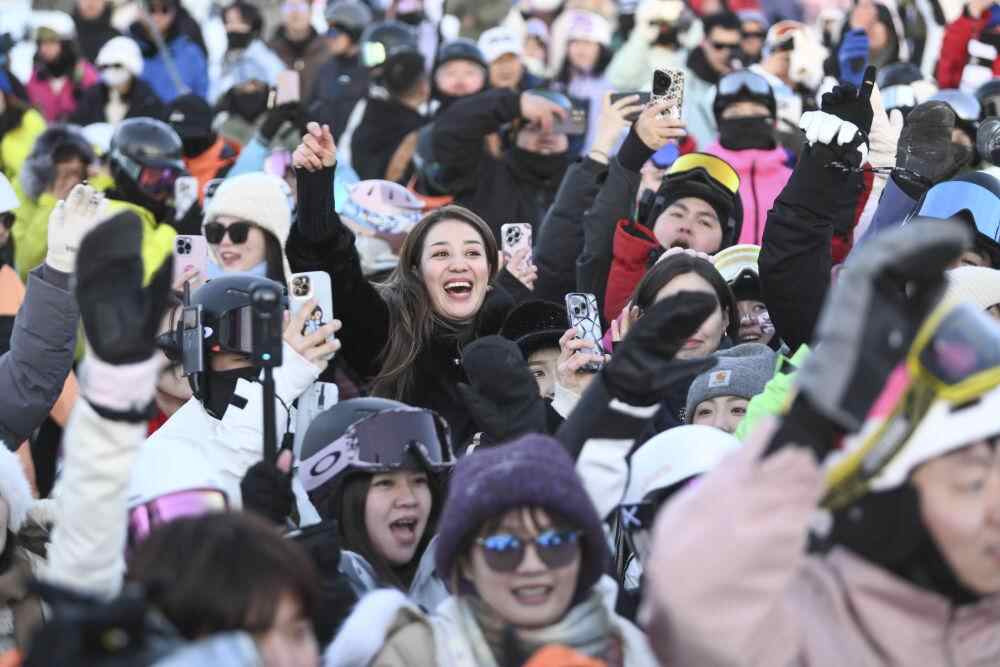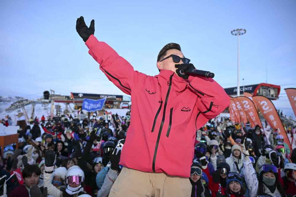 1月28日,在新疆阿勒泰将军山国际滑雪度假区,来自四川的主持人李权带领雪友和游客在“夕阳派对”上互动。