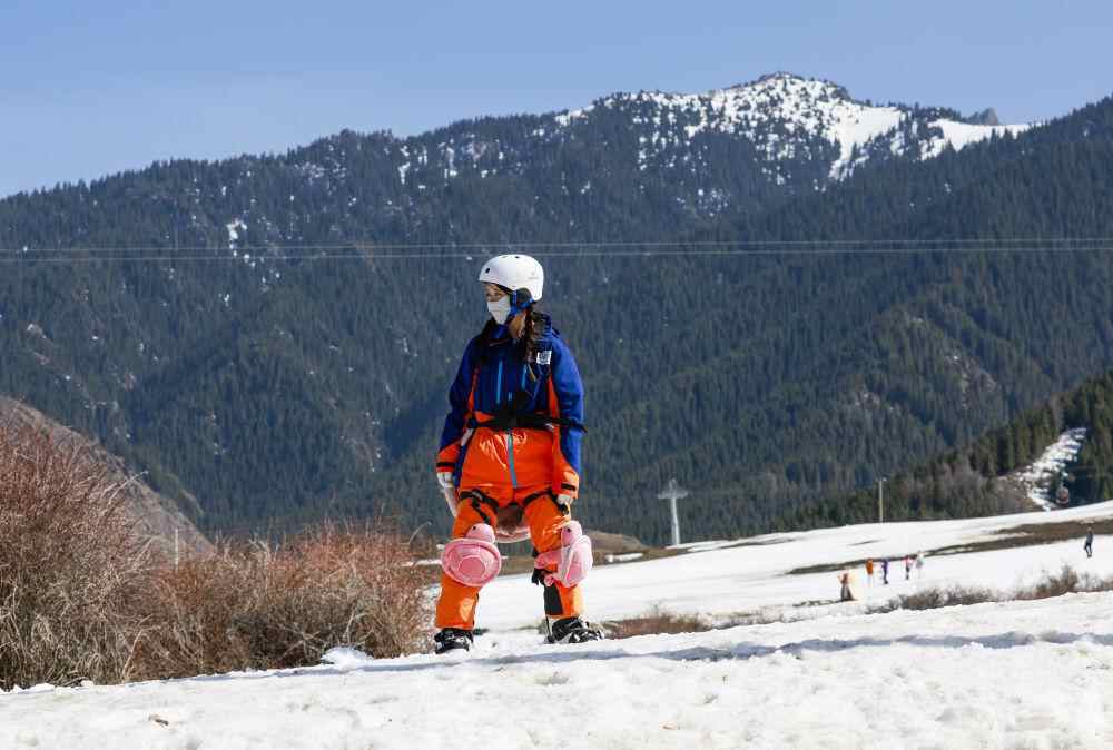 4月5日,一名雪友在新疆丝绸之路山地度假区滑雪。