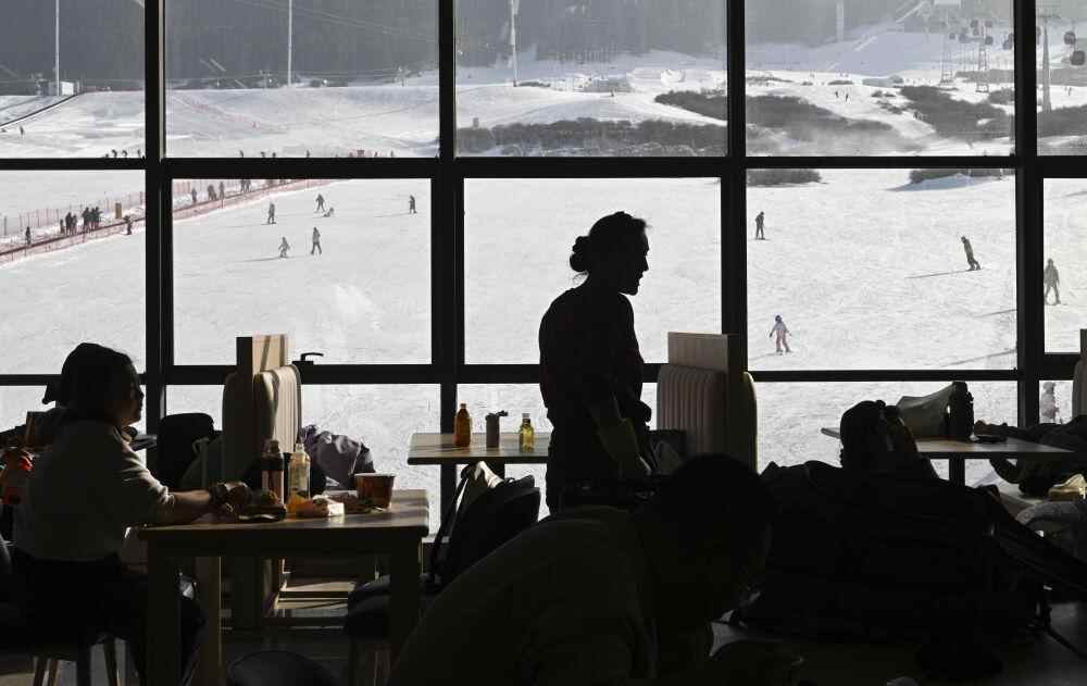 2月22日,游客在新疆丝绸之路山地度假区东区雪具大厅休息,窗外雪道上雪友疾驰。