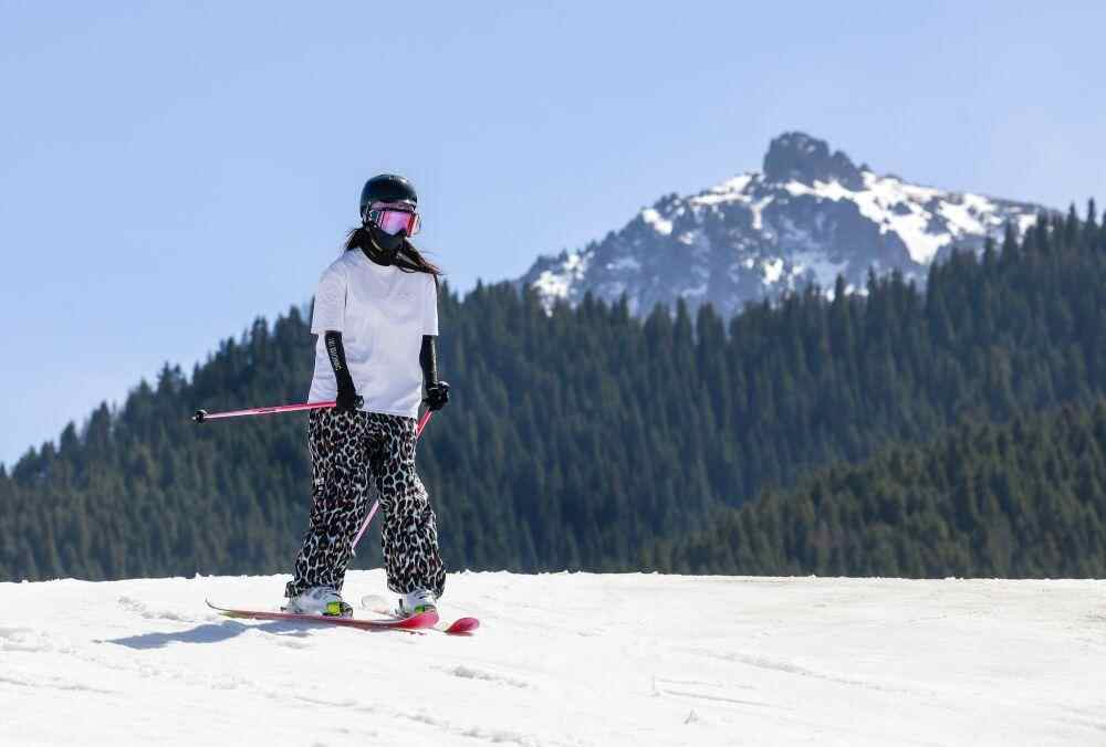 4月5日,雪友在新疆丝绸之路山地度假区滑雪。