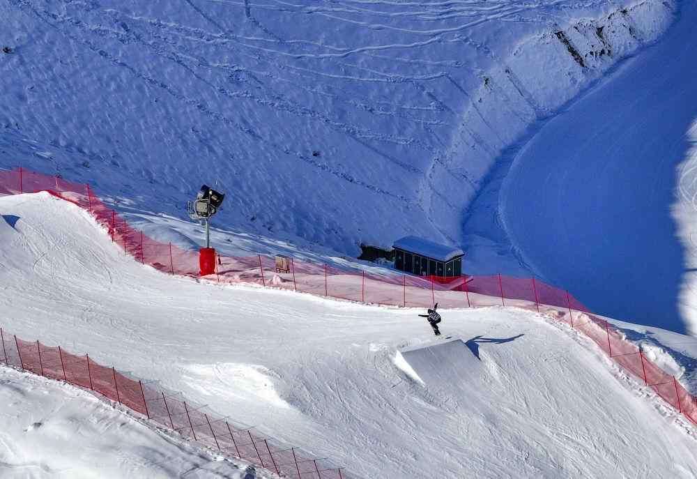 1月28日,雪友在新疆阿勒泰将军山国际滑雪度假区体验滑雪公园(无人机照片)。