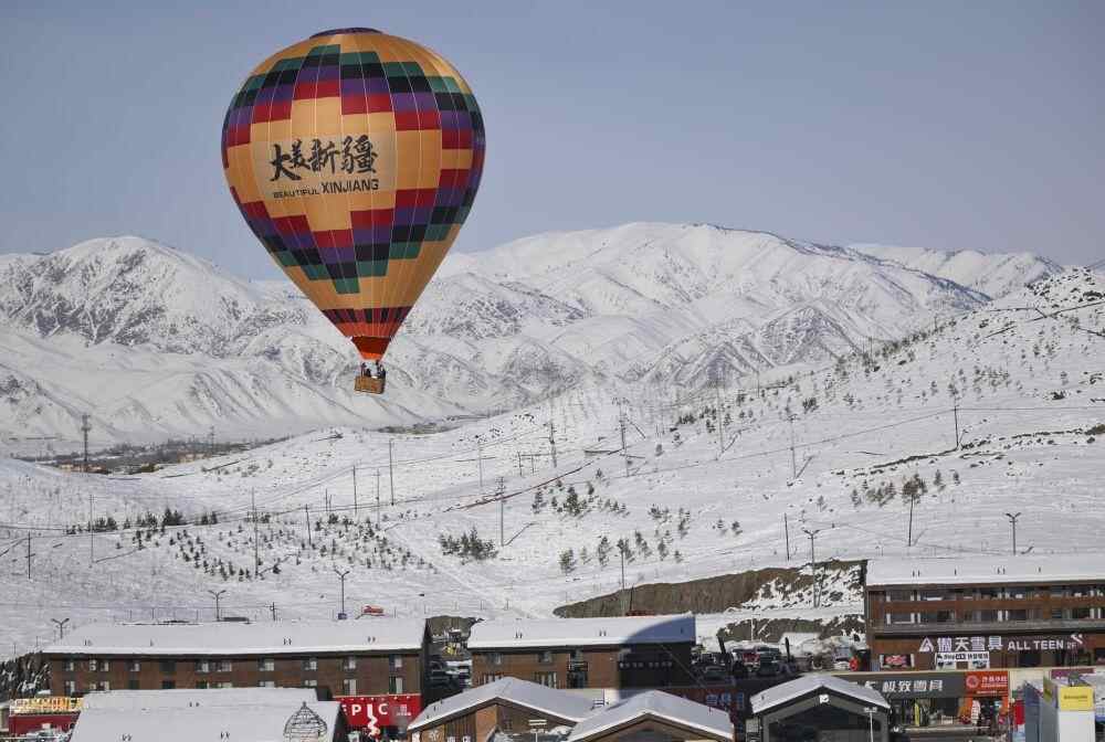 1月25日,游客在新疆阿勒泰将军山国际滑雪度假区乘坐热气球赏雪景。