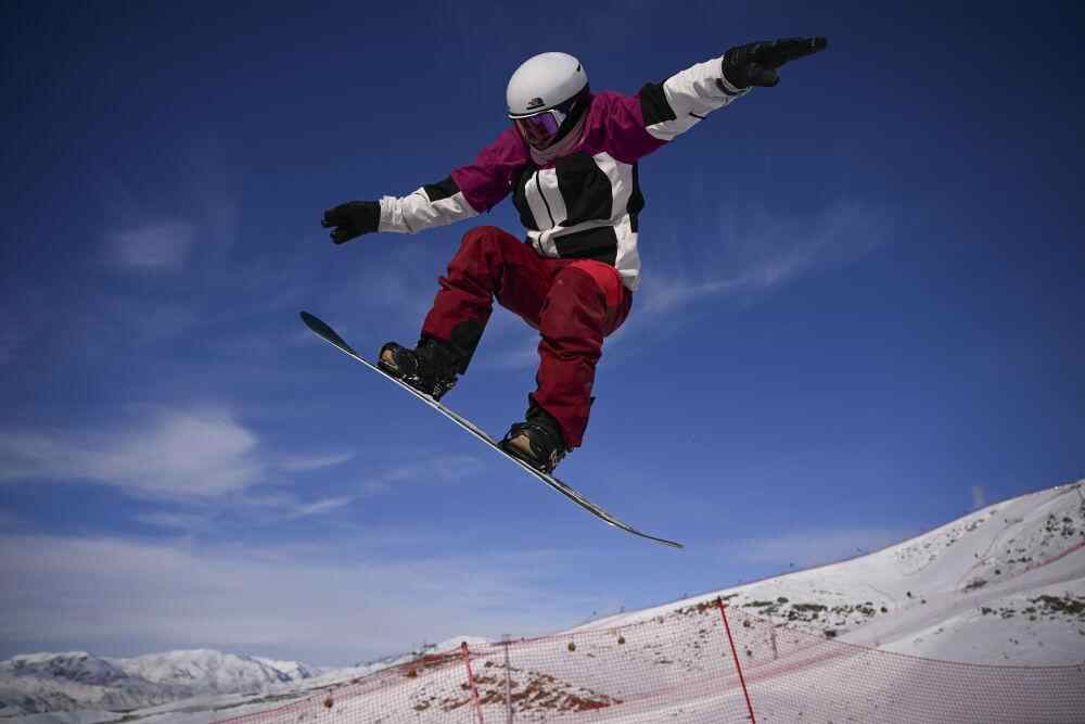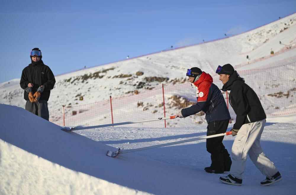 1月27日,新疆阿勒泰将军山国际滑雪度假区的滑雪公园运营团队成员乔木(中)、合勒木别克·哈布肯(右)、阿曼别克·金恩思汗一起修整跳台。冰雪产业的发展提供了新的岗位,带动新增就业。