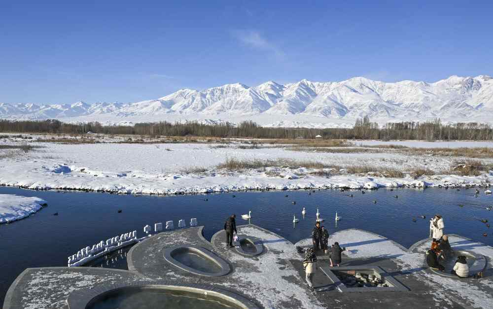 游客在新疆温泉国家湿地公园内体验温泉(2024年12月22日摄)。