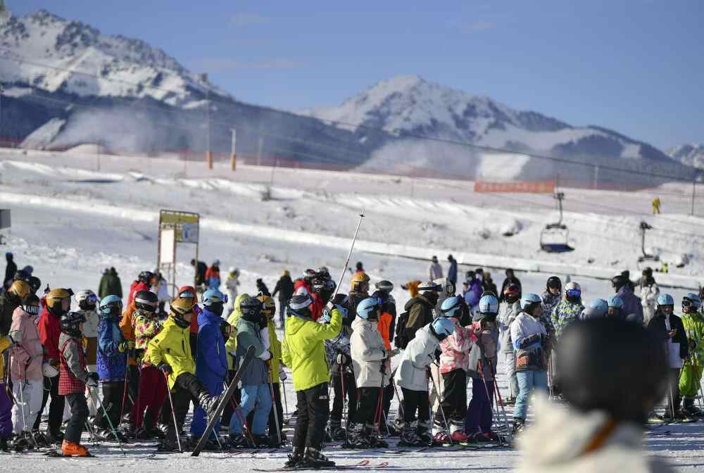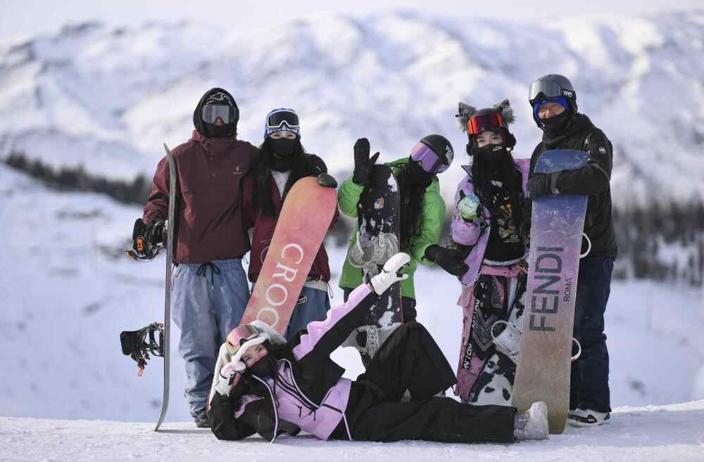 1月28日,农历除夕当天,来自浙江、湖北、四川等地的雪友在新疆阿勒泰将军山国际滑雪度假区合影。